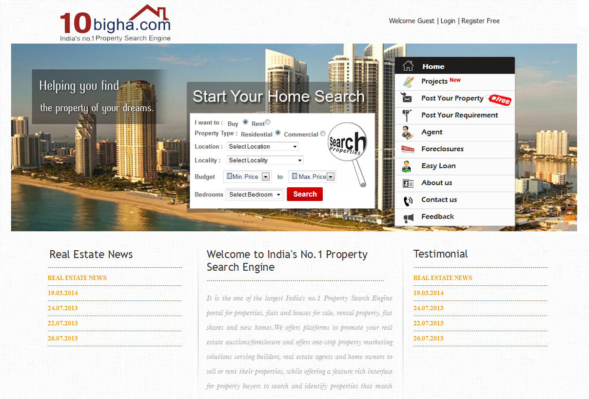10bigha is country's leading portal in the online real estate space. We offers one-stop property marketing solutions serving builders,real estate agents and home owners to sell or rent their properties, while offering a feature rich interface for property buyers to search and identify properties that match their requirement.